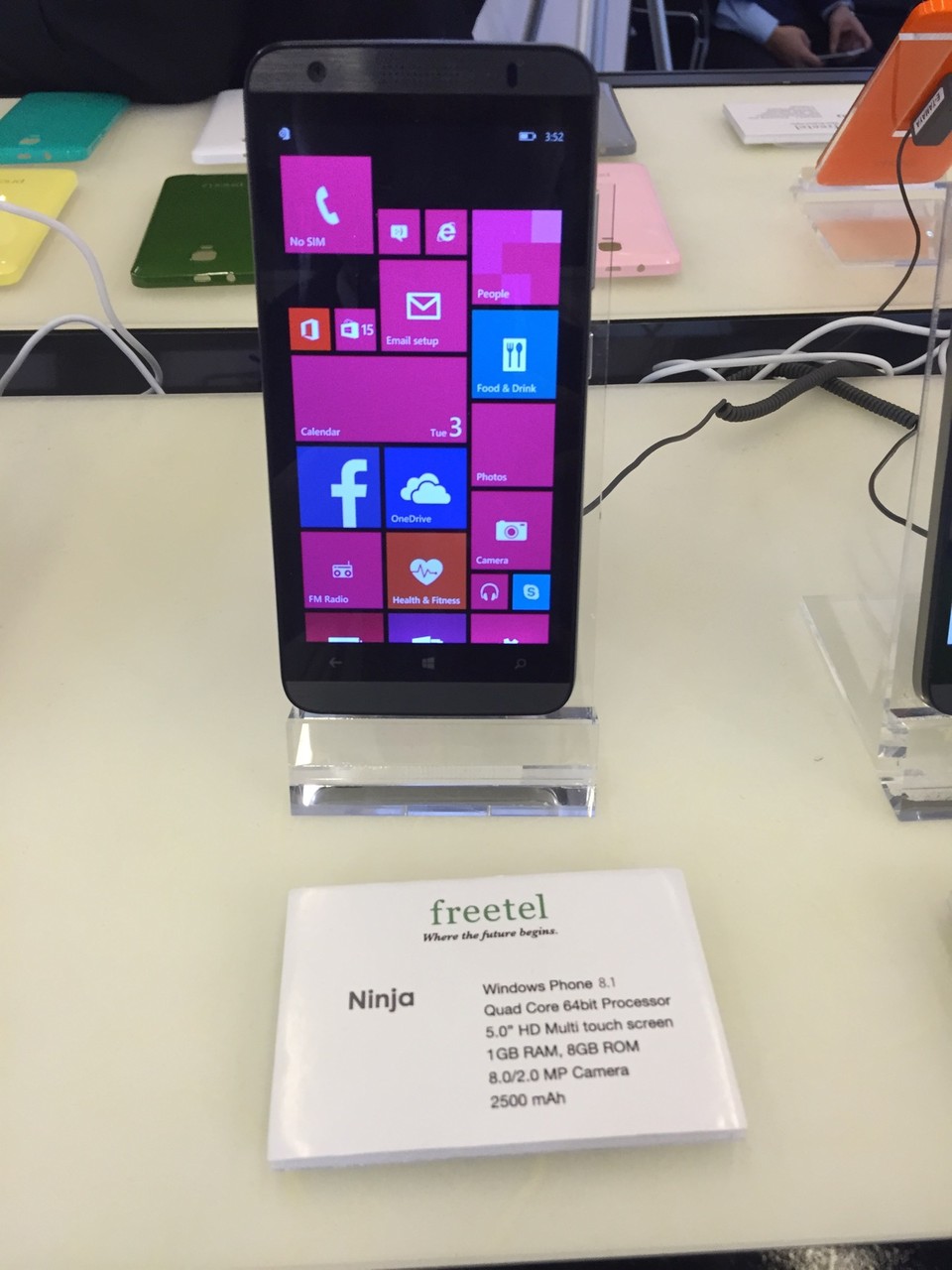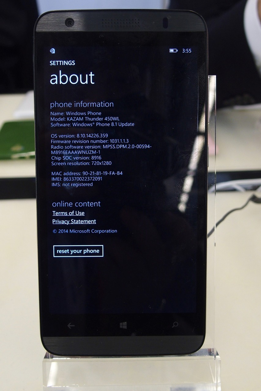 展示には日本国内で販売しているfreetelブランドの各種Androidスマホなどとともに実際にWindows Phone 8.1を採用したスマホも展示。NinjaはKAZAM製のODMで、「KAZAM Thunder 450WL」をベースにしています。