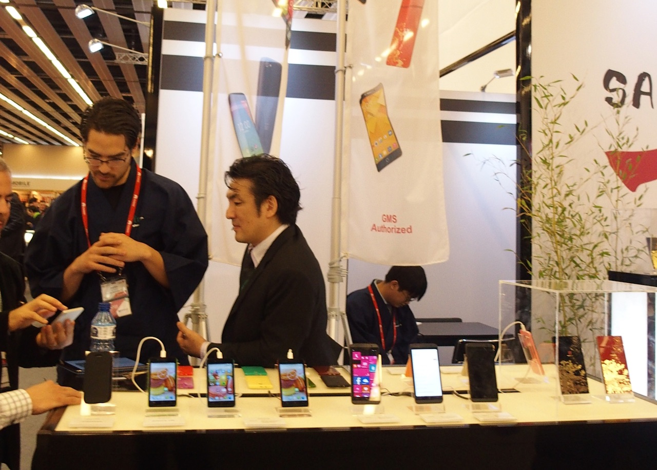 MWC 2015のfreetelブースでは「SAMURAI PROJECT」として"日本"をテーマにしており、"和"なイメージで展示員が鎧甲冑を身につけていたり、お茶会を披露したり、日本酒が振る舞われたりと日本メーカーであることを強くアピールしていました。