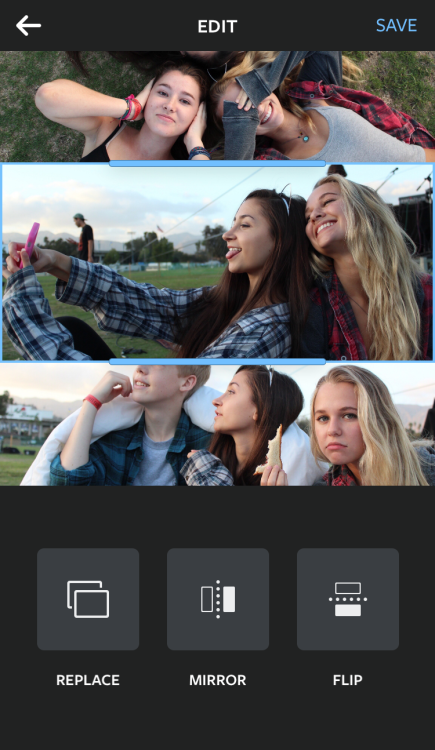 縦および横に並列させるなどの10種類のパターンからレイアウトを選択し、組み合わせる写真の位置やサイズ、上下左右に反転・回転、トリミングなどをして編集し、保存ボタンを押すとカメラロールにコラージュ写真が保存されるほか、保存画面からInstagramやFacebookに投稿できるようになっています。