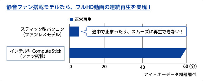 また、初代m-Stickでは熱問題となっていましたが、Compute Stickには冷却ファンが搭載されており、放熱性が高く、安定した動作を実現しているとしています。