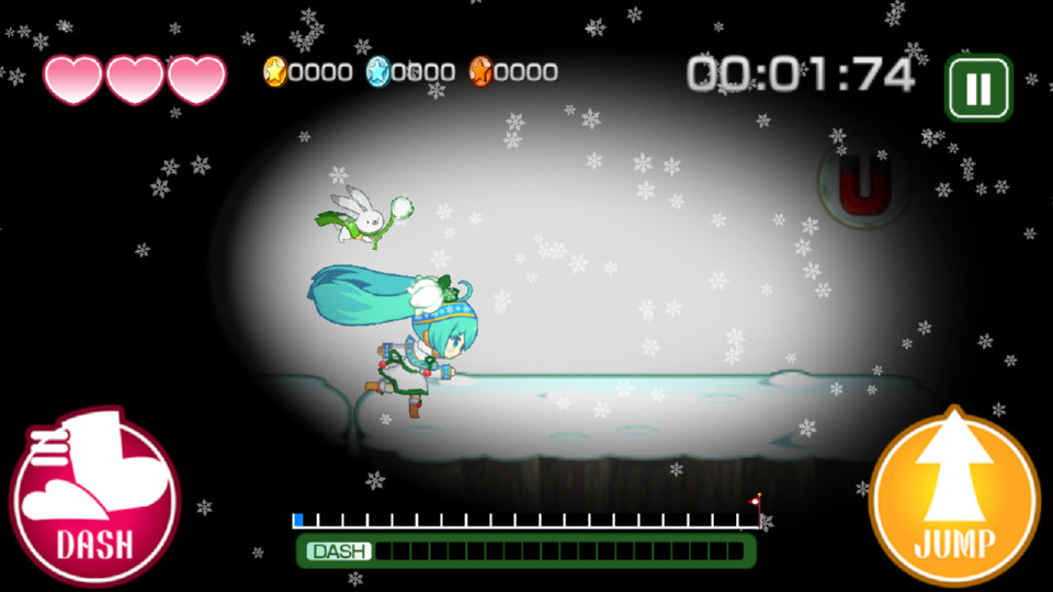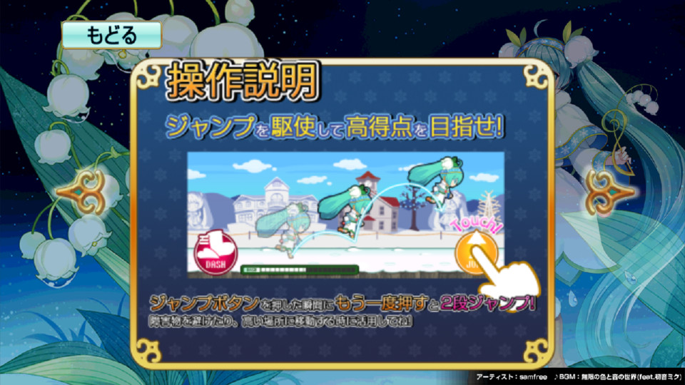 操作は画面左下ボタンの「ダッシュ」と画面右下ボタンにある「ジャンプ」の2種類。「ダッシュ」はボタンを押している間、ミクが全力疾走でより速く走ります。「ジャンプ」ボタンはミクがジャンプします。ミクは2段ジャンプ(ジャンプ中にもう一回ジャンプ)が可能で、これにより、より高い足場に上がって進むことができます。