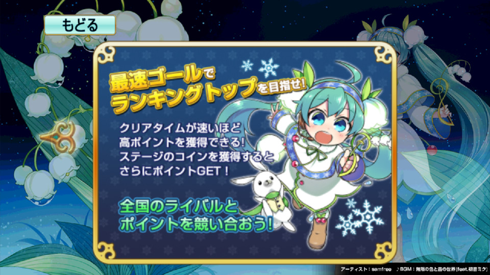このゲームは画面右方向へ向かって走る初音ミク(雪ミク)を操作して、ゴールへたどりつくことが目的です。ゴールへたどりつくまでにかかった時間などからスコア(得点)が計算され、このスコアの高さを他のユーザーと競い合います(スコアに関しては後述)。