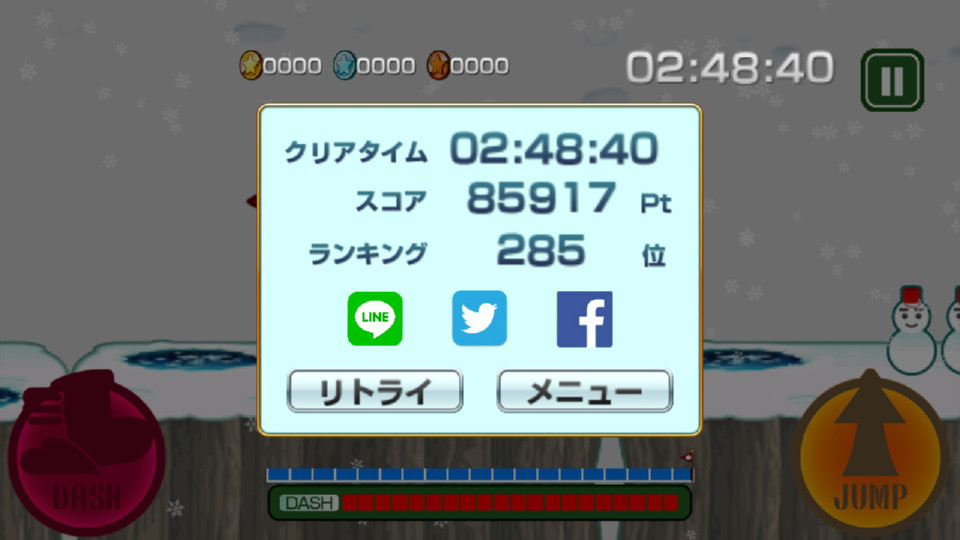 ゲーム結果はランキング表示が出るほか、TwitterやFacebook、LINEのタイムラインに流すことが可能