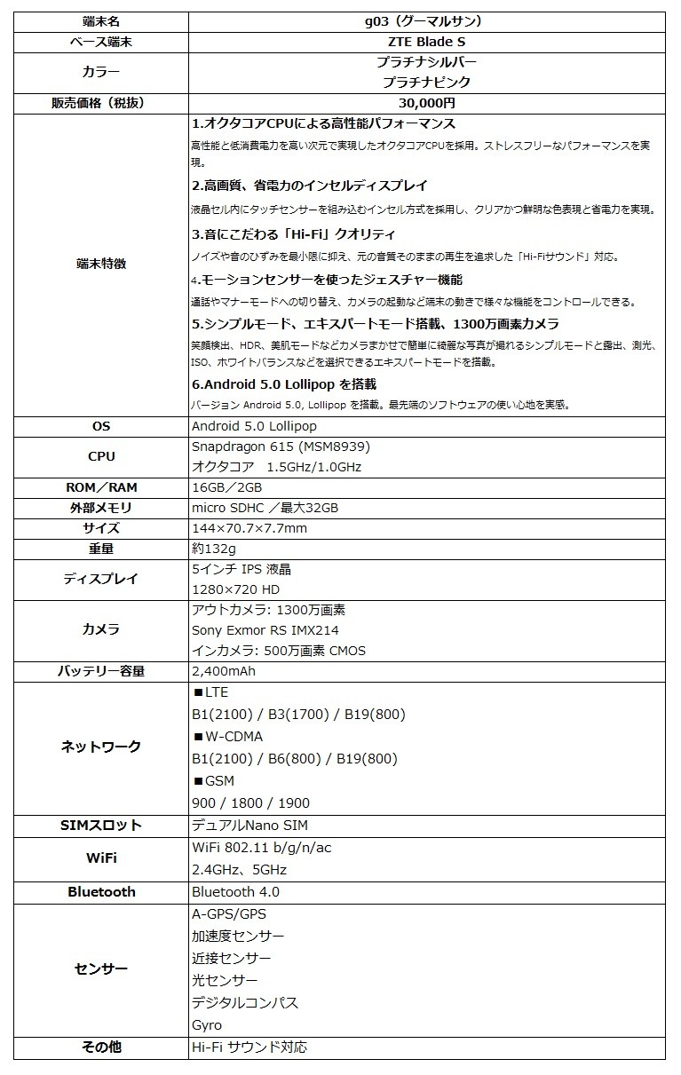 NTTレゾナントは22日、都内にて「事業戦略説明会」を開催し、同社が提供・運営するWebポータルサービス「goo」ブランドにて展開する格安スマートフォン(スマホ)サービス「gooのスマホ」において新たにZTE製のAndroid 5.0(開発コード名:Lollipop)を搭載した新機種「g01(グーマルイチ)」(「ZTE Blade L3」相当)および「g02(グーマルニ)」(「ZTE Blade S Lite」相当)、「g03(グーマルサン)」(「ZTE Blade S」相当)の3機種を発売すると発表しています。