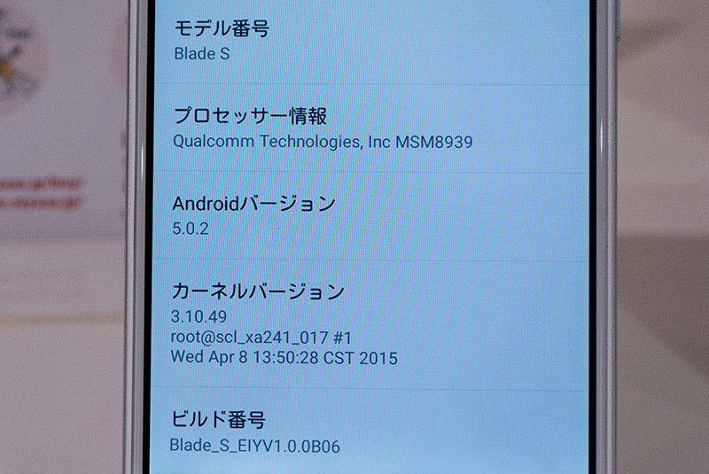 g02との違いは背面の機種名もしくは、端末情報の「モデル番号」(Blade S)でやっと確認できた。プロセッサ情報は「Qualcomm MSM8939」となっており、オクタコアCPUモデル(クアッドコア 1.7GHzと1.0GHzの64bit対応コア「Cortex-A53」をそれぞれ4コアずつ2基搭載)であることがわかる。