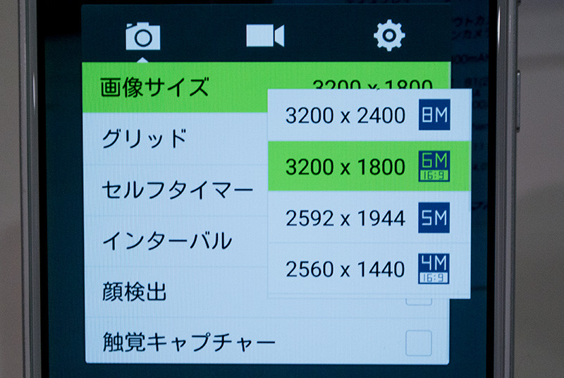 カメラの設定メニューでアスペクト比4:3の3200×2400ピクセルまで設定できる。