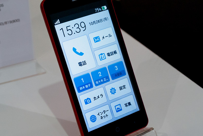 エントリーモデルだけに、簡単操作可能な「goo やさしいスマホ」が6月出荷以降のg01にプリインストールされる(画面は試作のもの)。表示が大きいだけではなく、ワンタッチで電話が掛けられるなどシニア向けに作り込まれている。