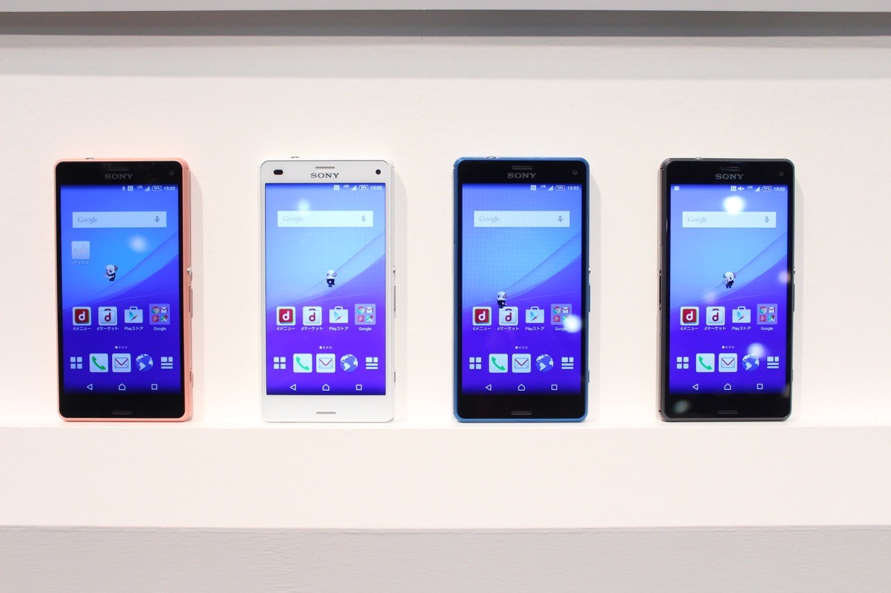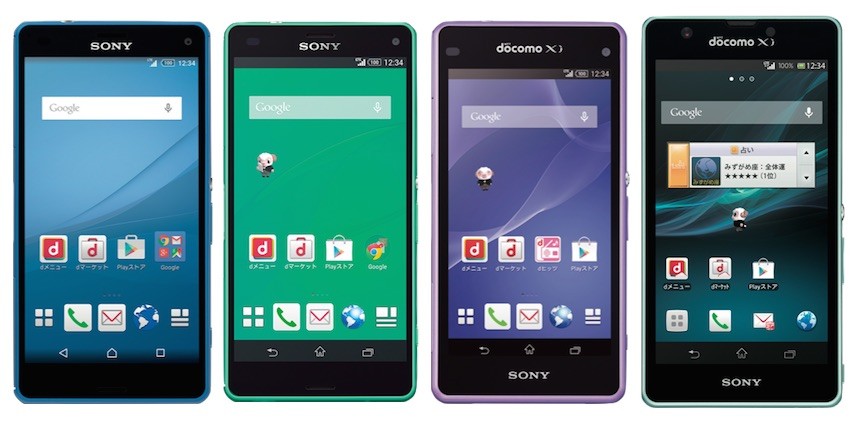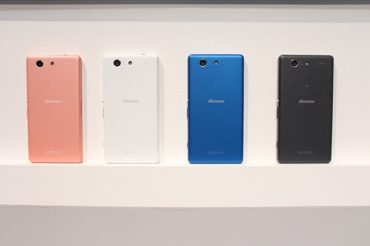 左からXperia A4 SO-04G(Blue)およびXperia Z3 Compact SO-02G(Silver Green)、Xperia A2 SO-04F(Lavender)、Xperia A SO-04E(Mint)