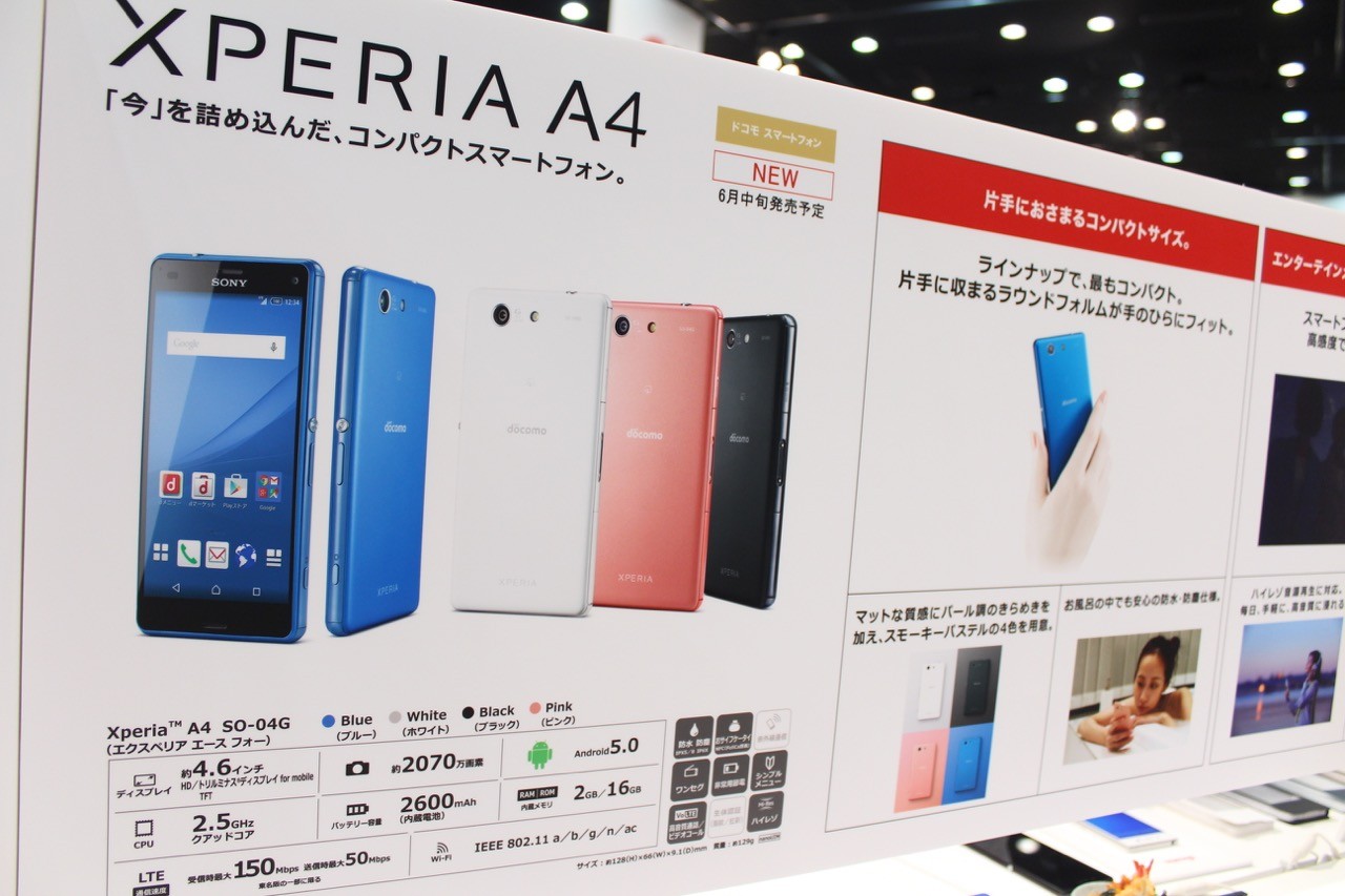 Xperia A4 SO-04Gは昨年秋冬のコンパクトフラッグシップモデル「Xperia Z3 Compact」をベースにし、Xperia A SO-04Eや昨夏モデル「Xperia A2 SO-04F」に続く「Xperia A」シリーズ第3弾です。
