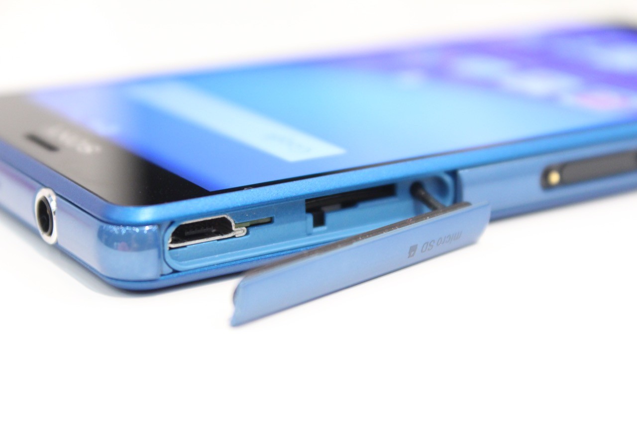 microSDカードスロットおよびmicroUSB端子があるカバーを開けたところ。Xperia Z4シリーズではmicroUSB端子もキャップレスになったので、Xperia A4も変更して欲しかったところ