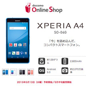 既報通り、今夏以降に発売・開始する新モデルや新サービスを披露する「2015夏モデル新商品発表会」を開催し、約4.6インチHD(720×1280ドット)液晶や2.5GHzクアッドコアCPUなどを搭載したAndroid 5.0(開発コード名:Lollipop)採用スマートフォン(スマホ)「Xperia A4 SO-04G」(ソニーモバイルコミュニケーションズ製)を発表しています。
