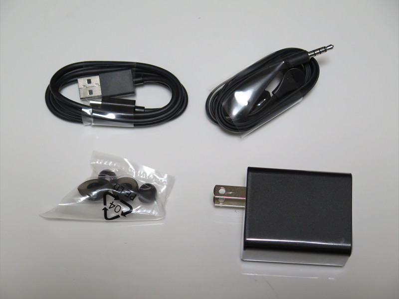 ケーブル類としてはUSB充電用アダプターおよびmicroUSBケーブル、カナル型イヤホンと交換用イヤピース(サイズ3種)が付属していました。