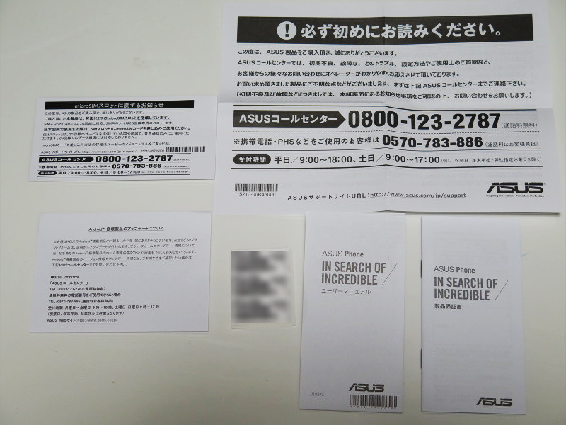マニュアル類は本体マニュアルおよび保証書、アップデートについての注意書き、コールセンターの連絡先が書かれた注意書き、挿入するSIMカードについて書かれた注意書き、本体のシリアルナンバーなどが印刷されたシールが入っています。