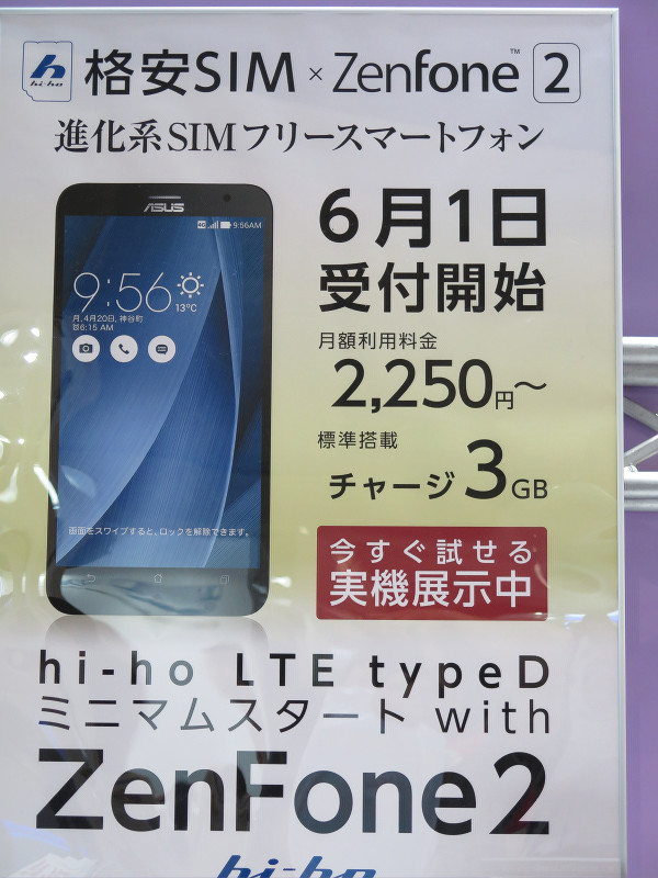 IIJのMVNE事業の事例(写真=左)とIIJグループのhi-hoがSIMフリーな最新フラッグシップスマホ「ZenFone 2」との回線セット販売予定を告知していた(写真=右)
