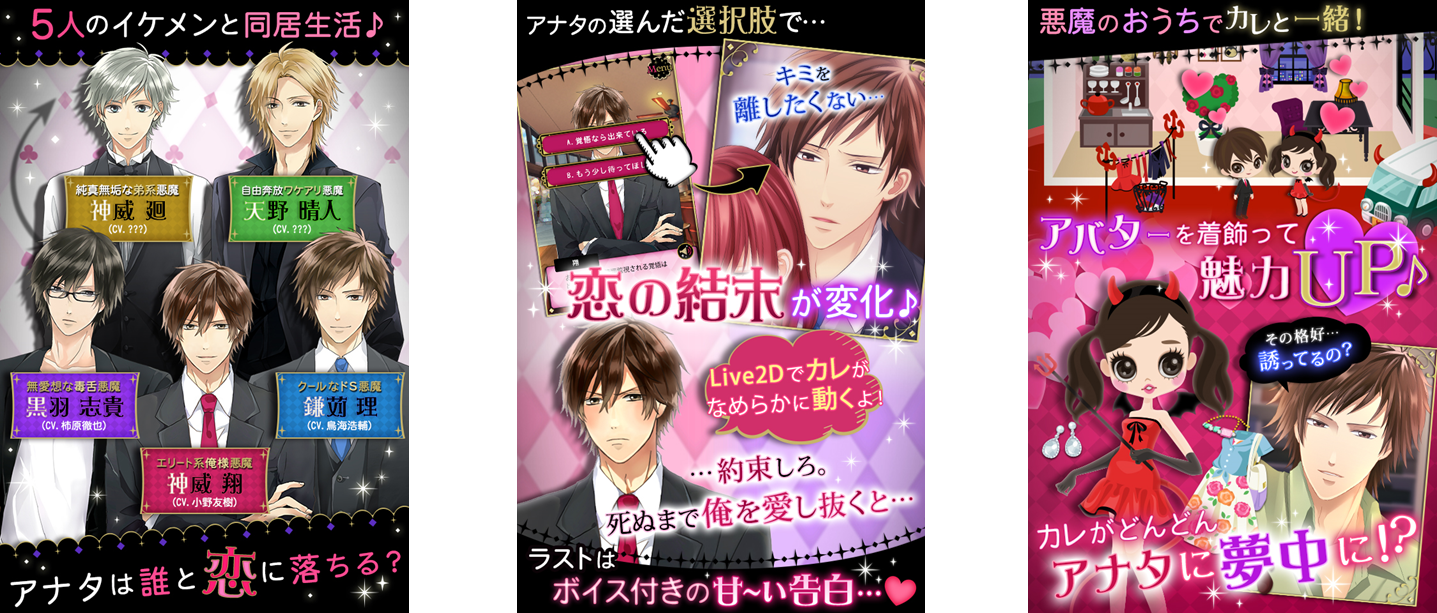 内容としてはまず恋の相手となる悪魔を選択し、ゲーム内の随所でさまざまな設問が現れるので、その選択によってストーリーのエンディングが変わります。自分自身の分身として「アバター」をお気に入りの衣装にかわいく着せ替えさせたり、悪魔ハウスのインテリアをおしゃれにデコレーションしたりすることも可能で、ワンタッチ操作が簡単なため、ドラマやマンガ作品のような感覚でもプレイできます。