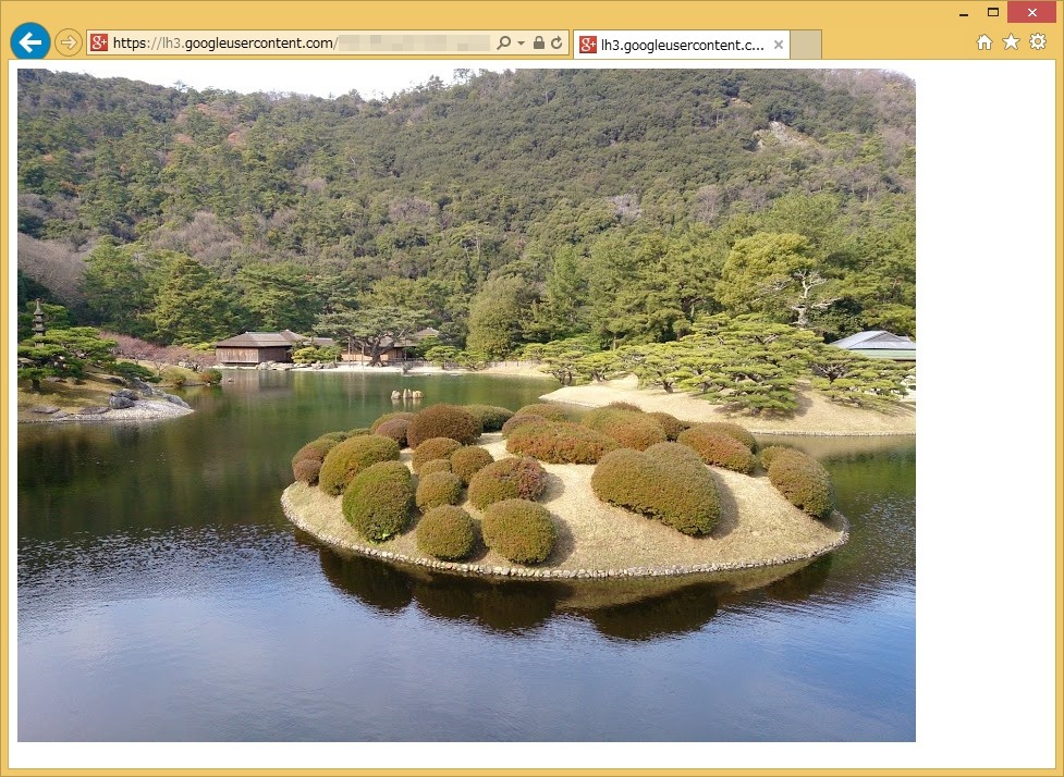 そして、コピーしたブラウザーを(自身のアカウントでログインしていない)別のWebブラウザーでロードすると、その写真が表示されます(*1)。ログインしていなくても表示されることから、URLさえわかってしまえば世界中の誰もが写真を参照できると言えます。