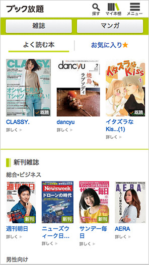 雑誌はビジネス誌や総合週刊誌、男性・女性ファッション誌、趣味系の雑誌など130誌以上の豊富なラインアップ、マンガは少年・少女向け、男性・女性向けの1000以上の人気作品が全巻読めるほか、毎月新しい作品が追加されるので、飽きることなく楽しめます。