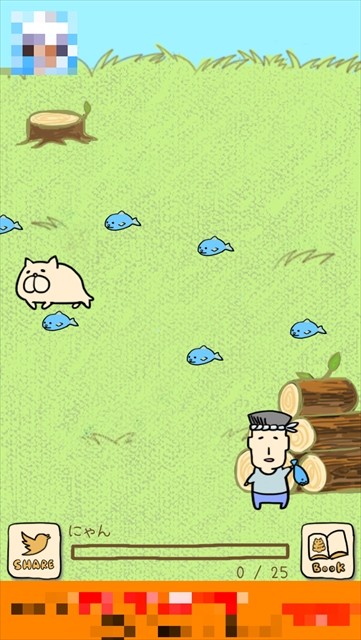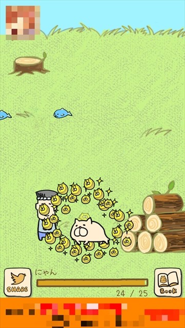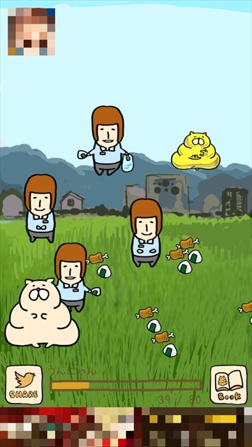 まずはうんにゃんこの周りを歩いている村人をタップして、エサをもらいましょう!エサを食べと下のバーに色がつき、経験値が貯まっていきます。