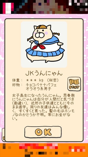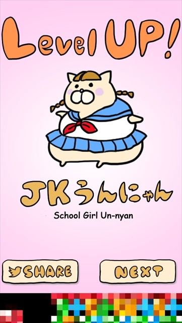 JKの次に成長したうんにゃんこの姿は、意外か納得か、その姿は遊んだ者にしか分からない!JKまでは比較的早い段階で成長するのでちょっとした空き時間や移動のヒマつぶしに是非遊んでみてくださいね♪