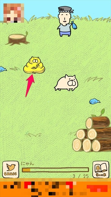 ゲームを進めていくと、ランダムで黄色いナゾの生物が出現します!そして、口元をよ~く見ると、うんにゃんこと同じようにも見えますが……。