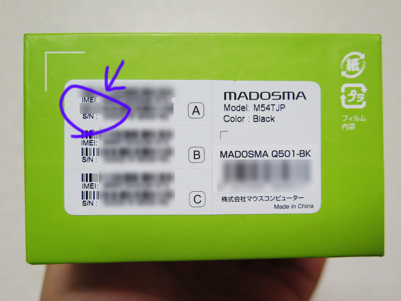 MADOSMAのIMEI番号は個装箱側面に印刷されています