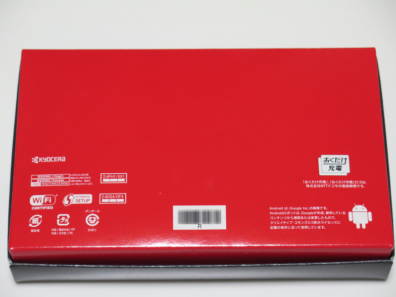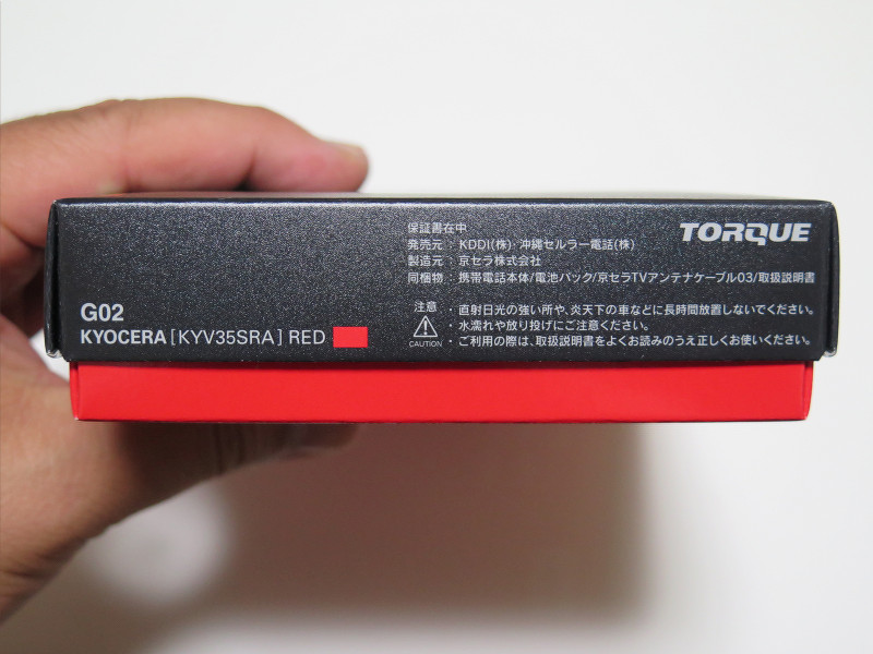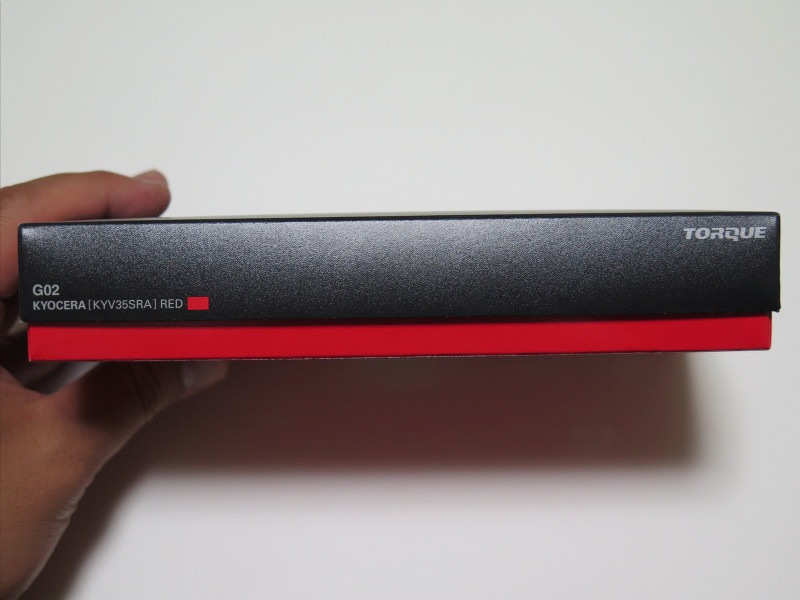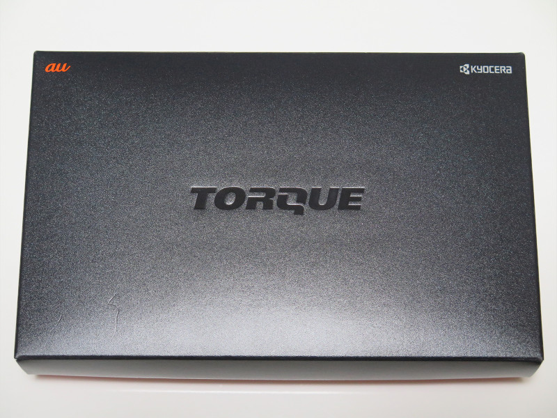 個装箱(パッケージ)の正面は黒地に「TORQUE」(と端っこにauとKYOCERAの文字)とシンプルで、無骨な印象も受けますが、これは製品コンセプトからすれば至極当然で大正解な感じです。