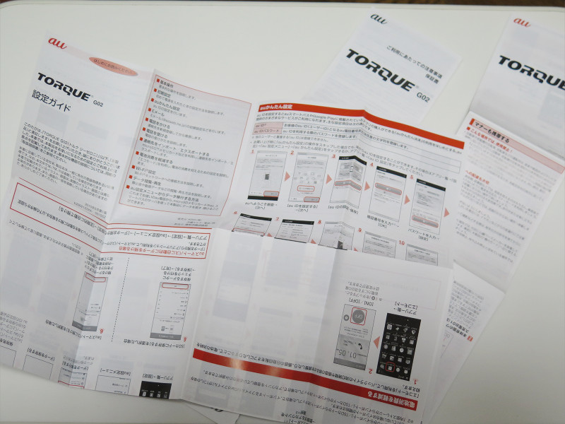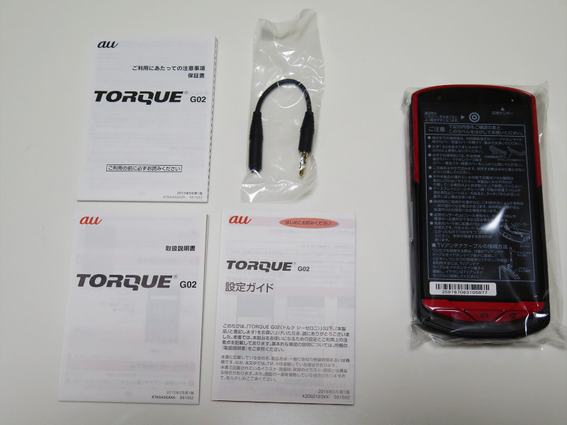 内容物としてはTORQUE G02本体およびワンセグ用アンテナケーブル、マニュアル類3種類のみで、USBケーブルすら入っていません。