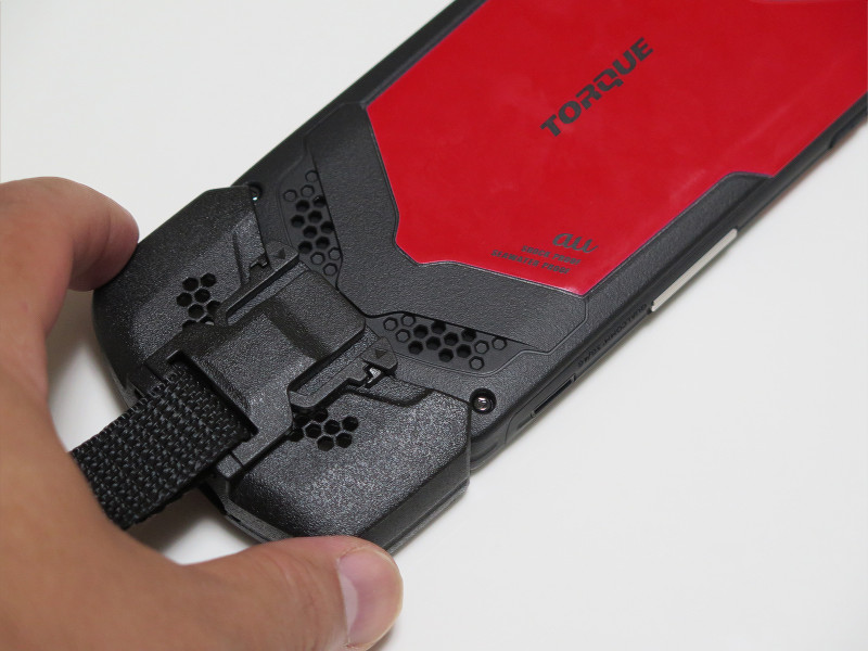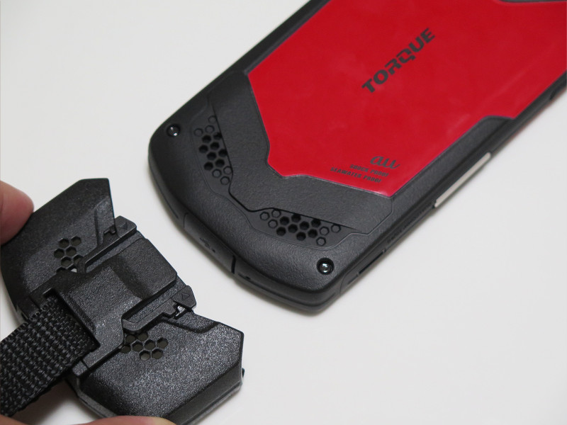 カバーのTORQUE G02への取り付けは簡単で、TORQUE G02本体背面の下側から装着すればOKです。