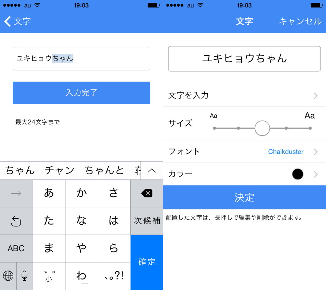 文字入力画面(左)、文字の編集画面(右)