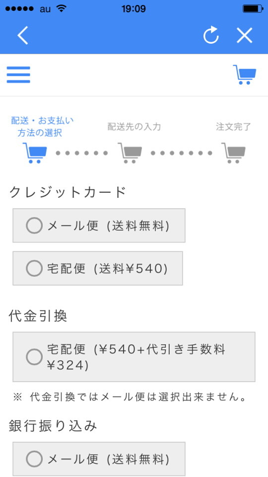 商品代のほか、送料は別途必要だが、メール便を選択もしくは3,000円以上の購入で送料は無料になる。商品ページで代金を確認して問題なければ「購入手続きに進む」をタップし、送付先の設定や決済手続きをしよう。