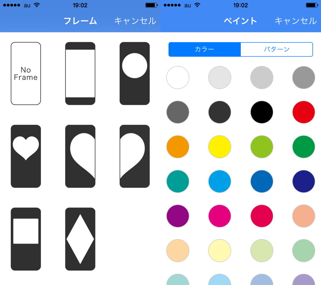 フレーム選択画面(左)、ペイント選択画面(右)