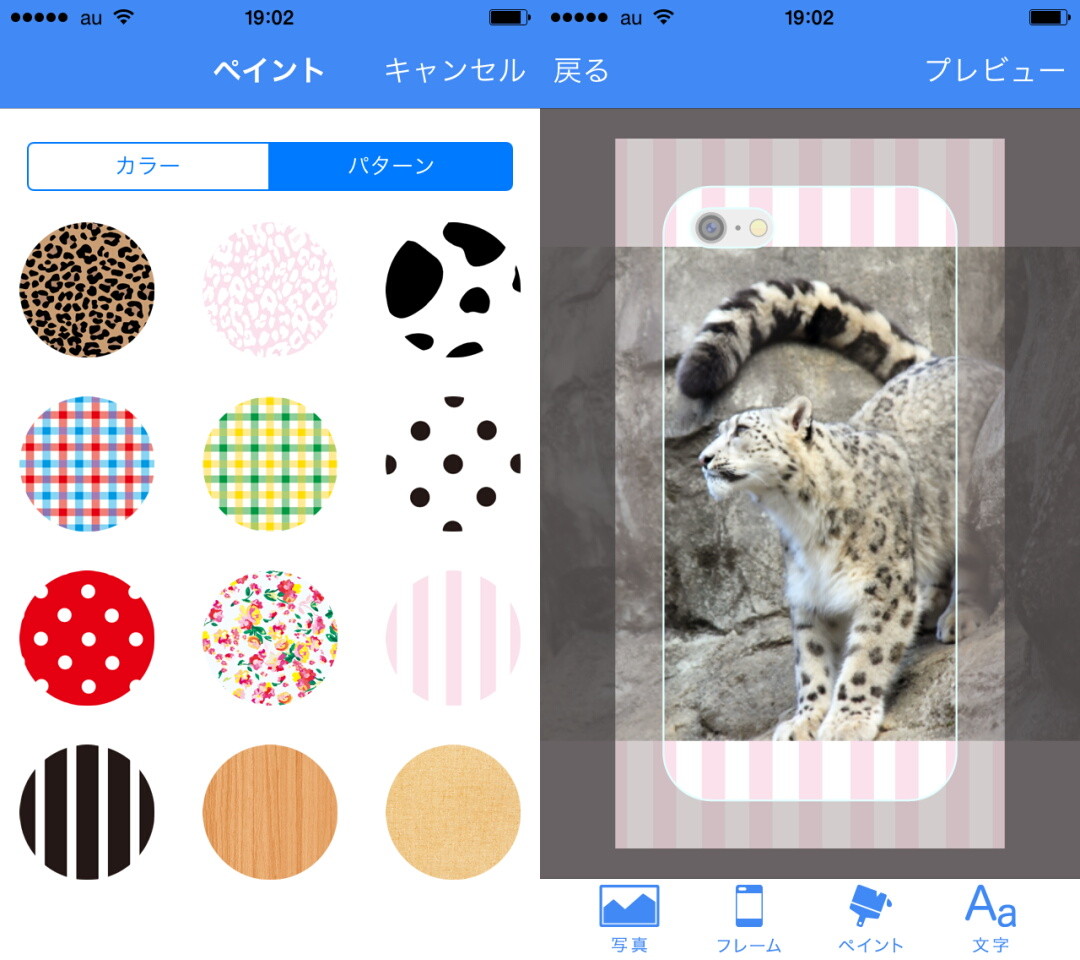 ペイント選択画面(左)、デザインを編集する画面(右)