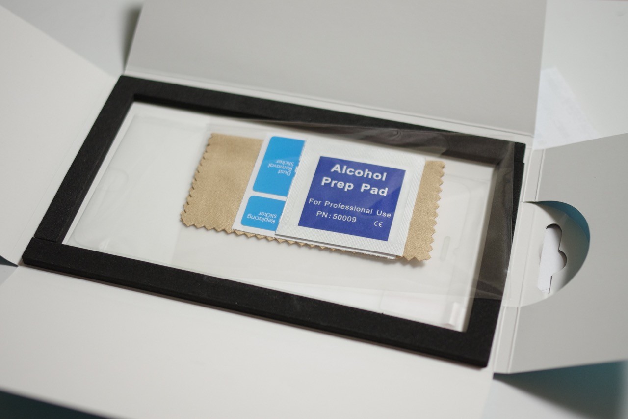 付属品はSmart Glass Screen Protector本体のほか、拭き取りクロスおよびホコリ取りシール、アルコールクリーニングパッド。箱(パッケージ)や内容物は至って普通のガラス保護シートといったところ。