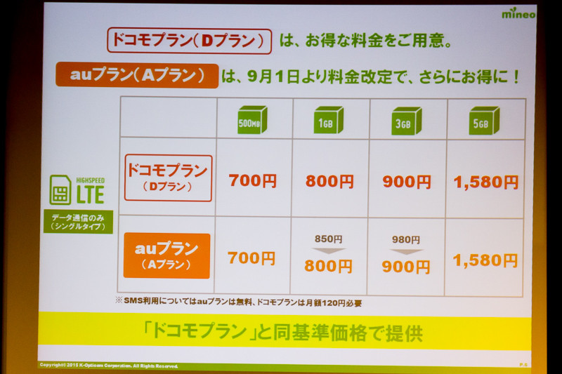 料金プランはデータ通信専用SIMカードが月500MBの通信量で700円から。ドコモプラン(Dプラン)に合わせてauプラン(Aプラン)の一部の料金が値下げとなっている。