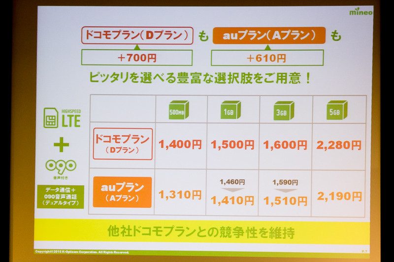 また、MVNOの競合他社と横並びの料金プランになったことについて津田氏は他社を超えた割引をすることは考えていないと述べていた。さらに、同氏は借り入れている元回線(ドコモプランおよびauプラン)をまたいだパケットの共有や複数回線割引などの他社にはない強みを持っていることで今後消費者に請求していくと説明した。