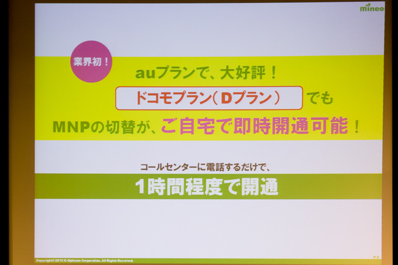 ドコモプランのMNP転入はmineoのコールセンターに電話し1時間程度で開通する。これまでもauプランではMNP転入の即日利用に対応していたが、auプランはWeb上から5分程度で開通するサービスを行っている。そのため、今後、ドコモプランでも同様のサービスを行えるよう検証中だという。