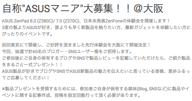 案内では「自称”ASUSマニア”大募集@大阪」とし、これまで東京で開催してきた先行体験会を大阪でも実施するとのこと。抽選で60名が募集されており、時間帯の異なる2回に分けて実施されます。