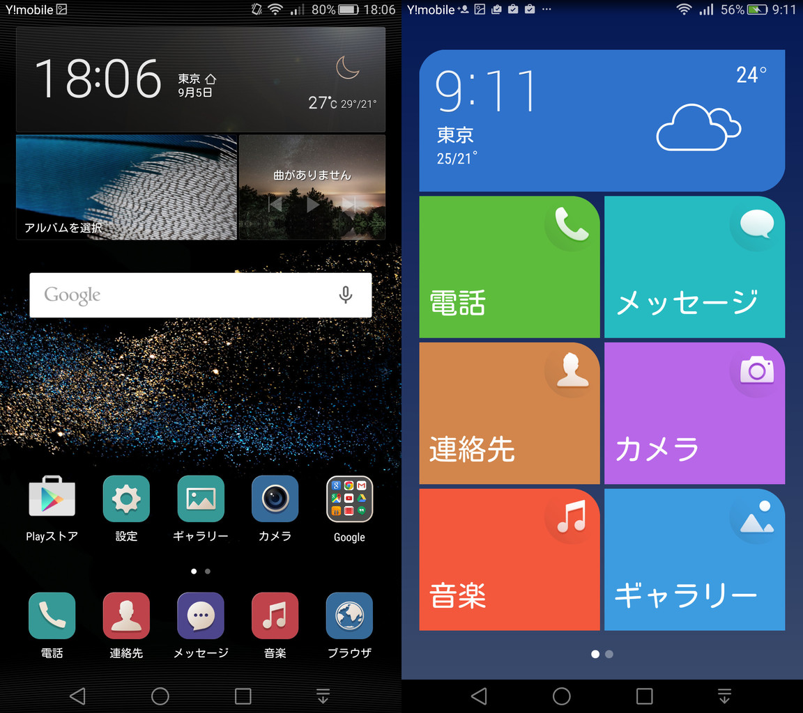 標準ホームスクリーン(写真=左)と、初心者やシニアでも分かりやすいシンプル表示(写真=右)