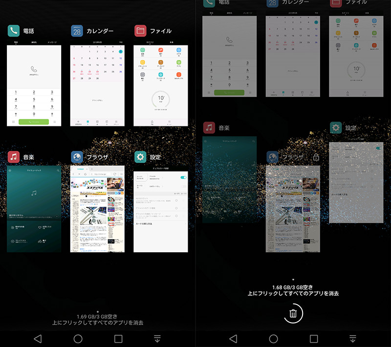 アプリ履歴画面。アプリを一度下にスワイプするとロックとなり、一括終了させないこともできる(写真=右)