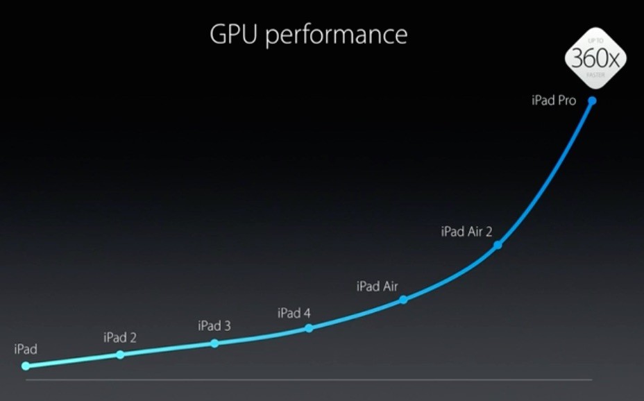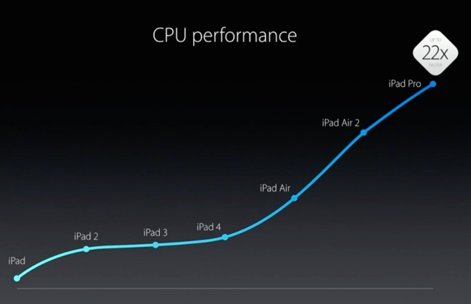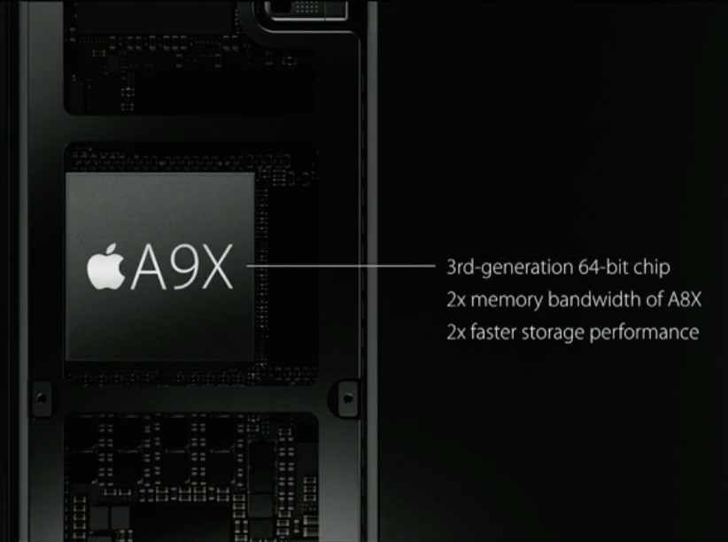 チップセットには64bit対応としては第3世代となる「Apple A9X」プロセッサーとモーションコプロセッサー「M9」を内蔵。A9XはiPad Air 2に搭載されているA8Xと比べるとCPUで1.8倍、GPUで2倍(初代iPad比でCPUで20倍、GPUで360倍)の性能だとのこと。