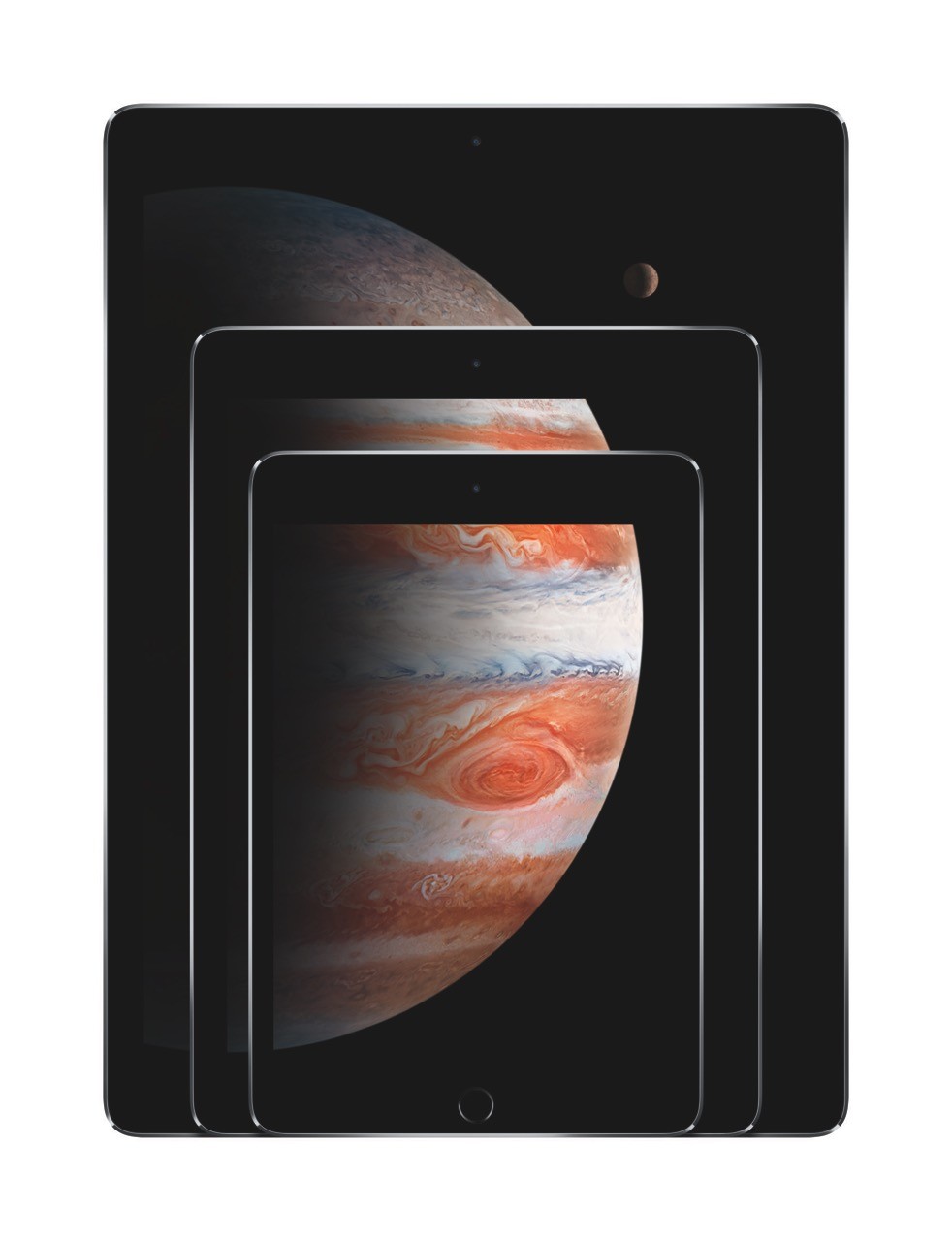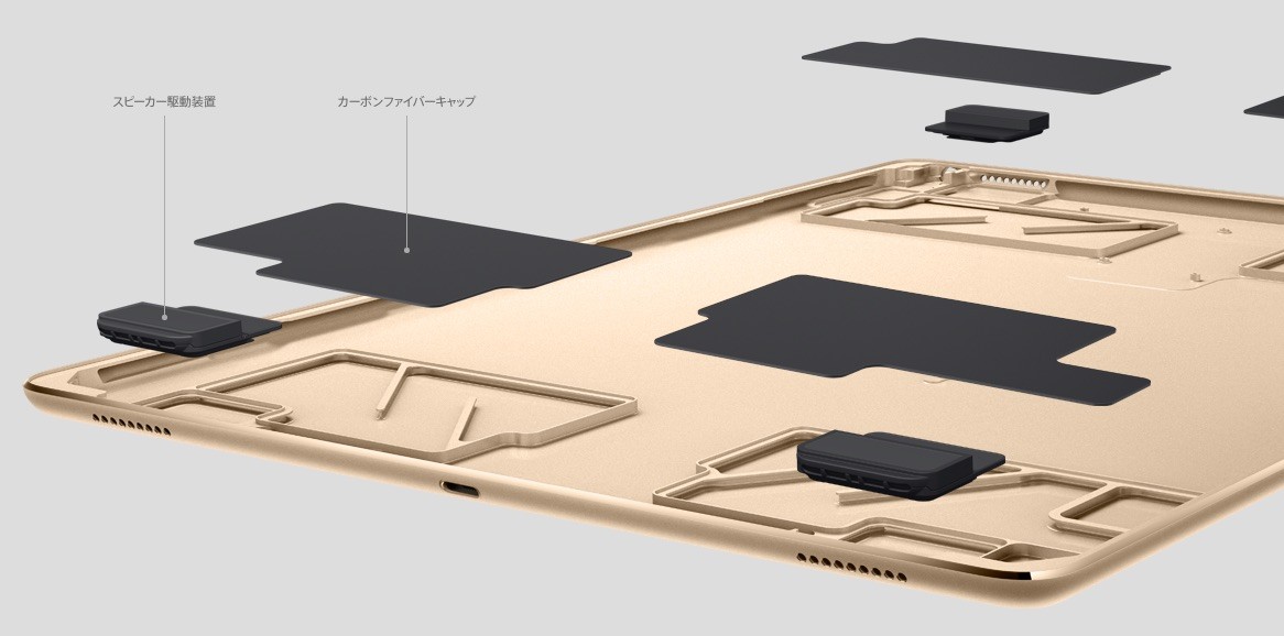 外観は従来のiPadシリーズを大きくしただけで、Touch ID対応ホームキーやLightning端子、3.5mmイヤホンマイク端子、電源/スリープキー、デュアルマイク、音量上下キーなどが配置されています。