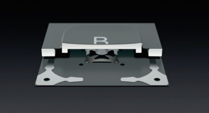 Smart Keyboardのカバーパネルは3種類の素材で作られており、Smart Coverと同じく、最上層は耐久性の高いポリウレタン製で、最下層は柔らかなマイクロファイバー製の裏地となっています。これにより、Smart Keyboardをたたんでいる時には裏地で画面を保護します。また、真ん中の層はファブリックの下に新しい導電性素材が入っていて、電力とデータが双方向に流れるようになっており、そのため、Smart Keyboardにはバッテリーやコード、電源スイッチがなく、導電性ファブリックは従来の電線とは違って、ほぼ紙一枚のような薄さながら長い期間にわたって繰り返し折り曲げても使い続けられる耐久性を持っています。