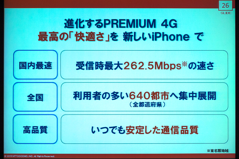 最後に、進化するPREMIUM 4Gは最高の「快適さ」を新しいiPhoneでと発表し、快適さを実現するために利用者の多い640都市へ集中展開し、いつでも安定した通信速度をめざすことを明言した。