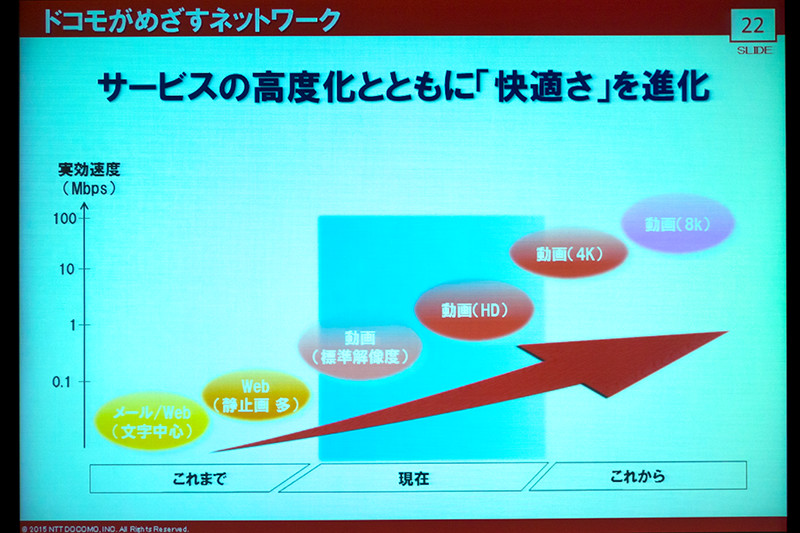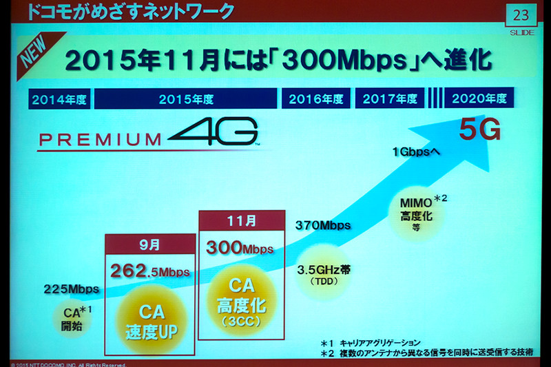 まずは、9月の262.5MbpsのCA速度アップに続き、11月には300MbpsのCA高度化(3CC、Band 1と19と21の3つを束ねたサービス)、2016年度には3.5GHz帯(TDD)による370Mbps、2017年度にはMIMO高度化などによる1Gbps、そして2020年度の5Gというロードマップを紹介した。