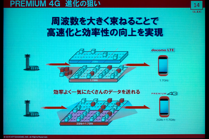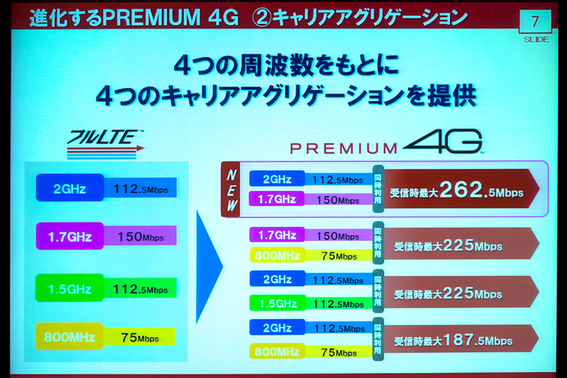NTTドコモは15日、都内にて「ネットワークに関する説明会」を開催し、すでに先日9月10日に発表した「PREMIUM 4G」を下り(受信時)最大262.5Mbpsに9月25日より高速化するほか、今年11月には3つの周波数帯を束ねて下り最大300Mbpsに高速化することを発表した。