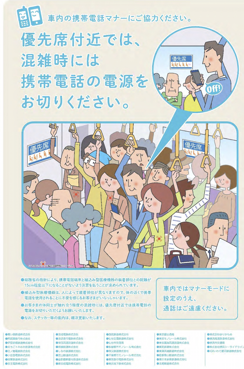 鉄道の車内での携帯電話の使用マナーで、優先席付近で電源切るように案内する呼び掛けは、従来は携帯電話の電波が心臓ペースメーカーに影響を及ぼす恐れがあるとして導入されました。