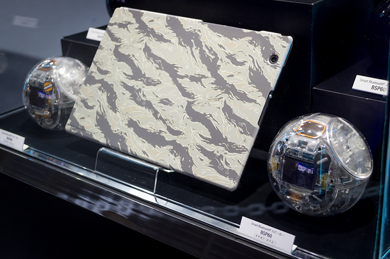 カモフラ柄のXperia Z4 Tabletのケースと、試作品のSmart Bluetoothスピーカー「BSP60 」のスケルトンバージョンが展示されていた。