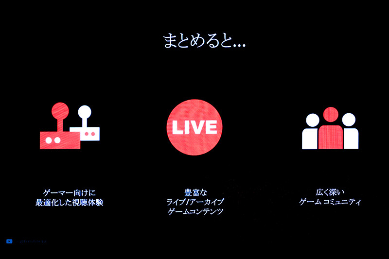 YouTubeブースは、ゲーマー同士を繋ぐコミュニケーションツールとしてライブストリーミング機能「YouTube Live」をアピールしていた。