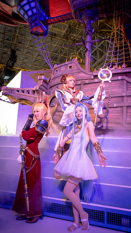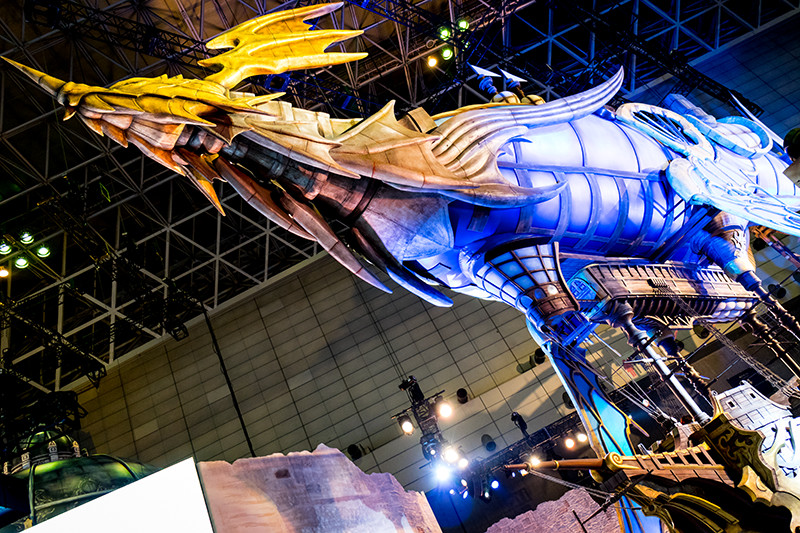 今回のブースの構成や世界感がいいと思ったのは「グランブルーファンタジー」のCygamesブースだ。コマ数最大規模と言われる巨大なブースの中には、ゲームに登場する圧巻「グランサイファー」の展示。ブース全体も照明やスモークなどの演出が美しく、CMではないが「グランブルー最高!」と言いたくなる出来映えだった。