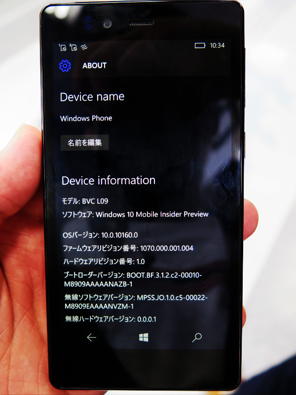 Windows 10 Mobileはまだ正式にはリリースされておらず、動作を検証するためのInsider Previre版となっていました。OSバージョンは「10.0.10160.0」、チップセットはQualcomm製「MSM8909(Snapdragon 210)」だと思われます。また、モデルが「BVC L09」となっており、ベースモデルはCoship Electronics(同洲電子)製「BVC L08」の後継機種だと推測されます。